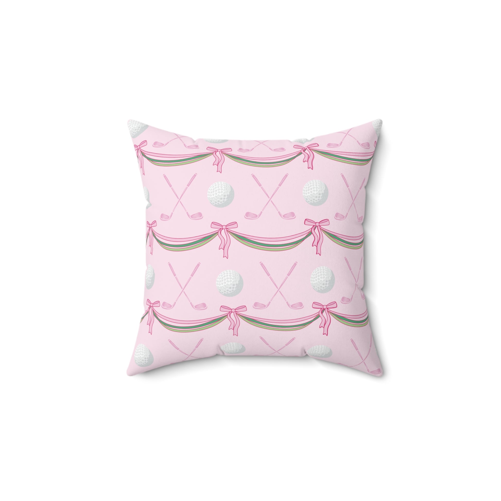 Golf Pattern Decorative Pillow — Pink Crossed Clubs, Balls & Ribbon Accent