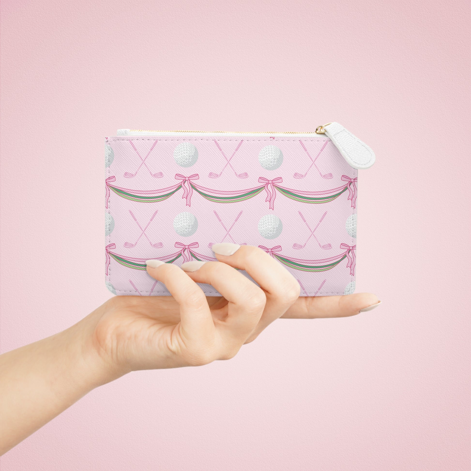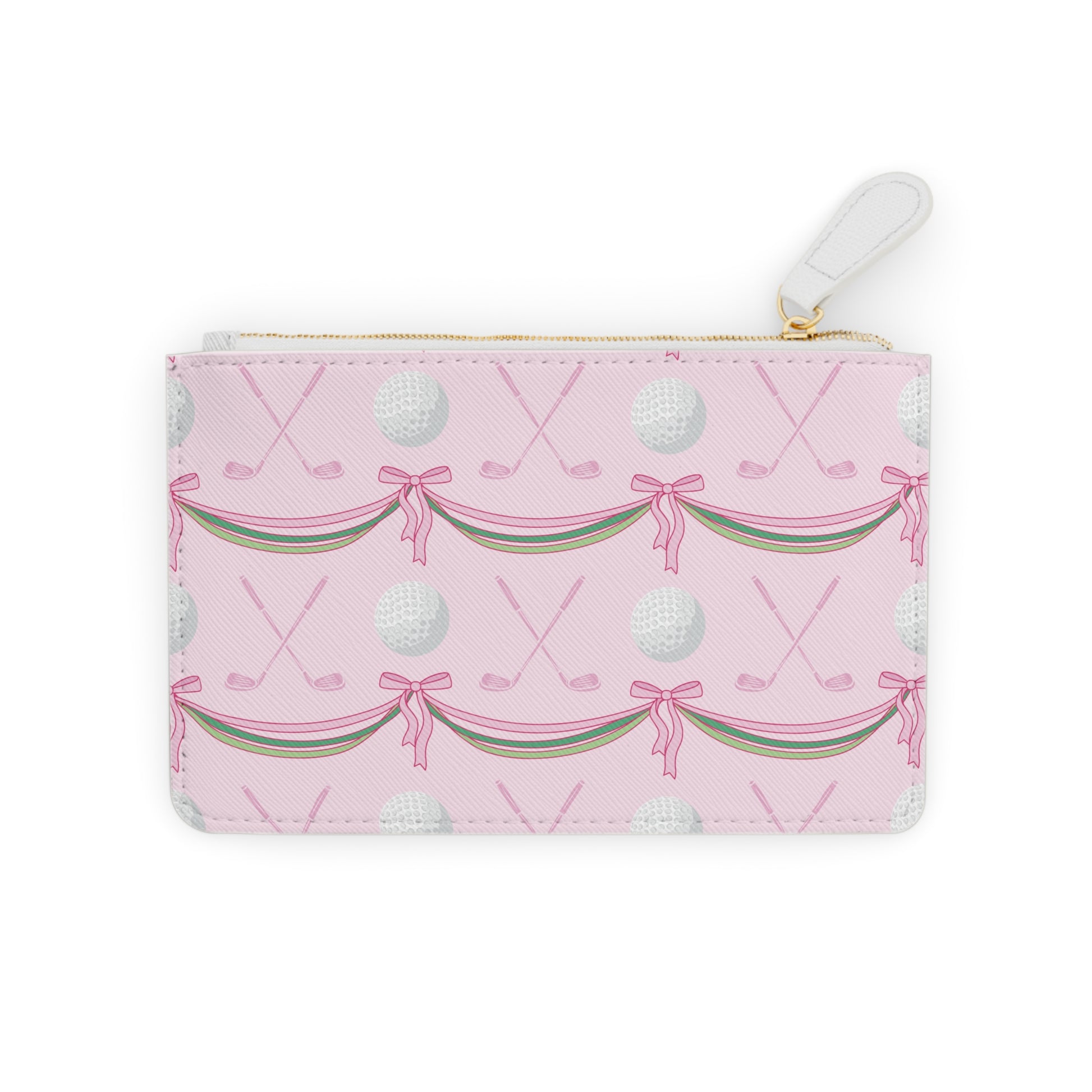 Mini Faux Leather Clutch — Pink Golf Pattern Wristlet (Golf Balls, Clubs & Bows)