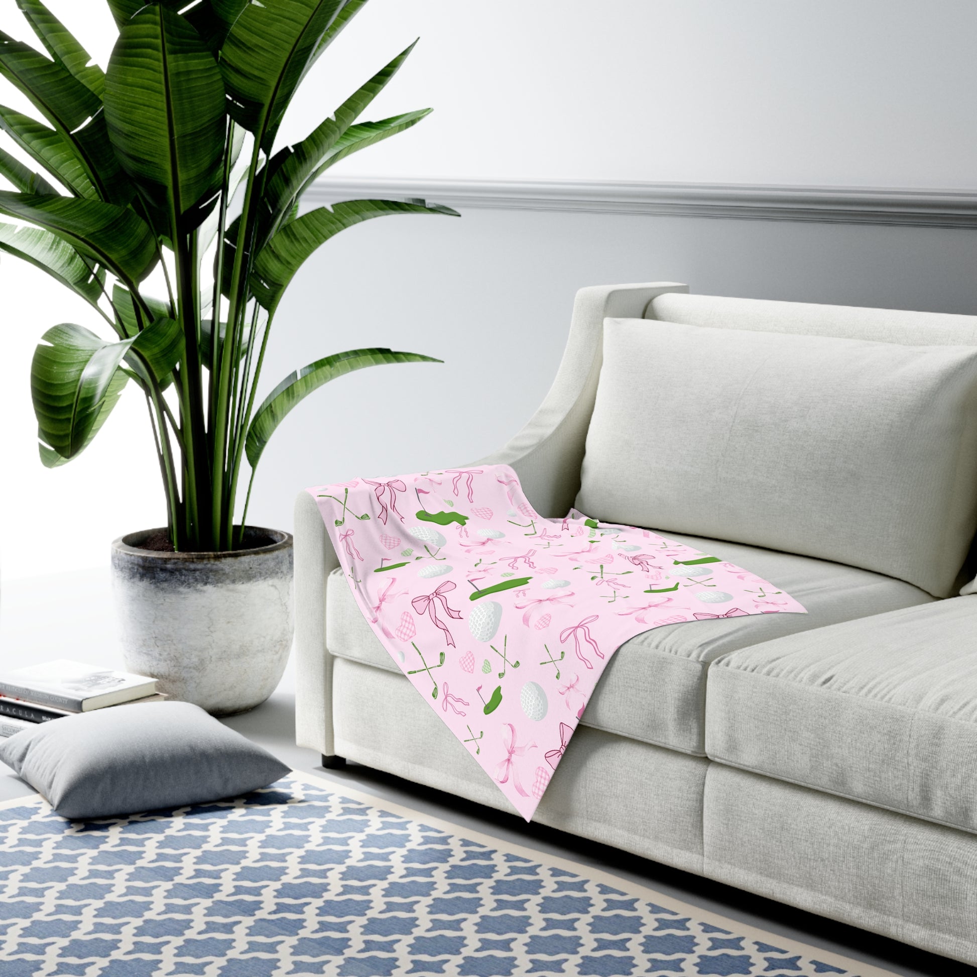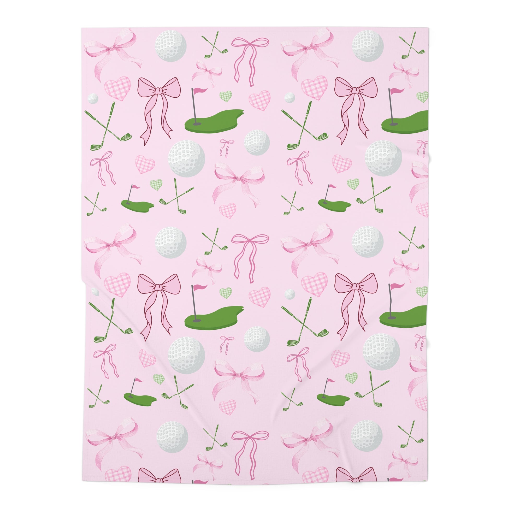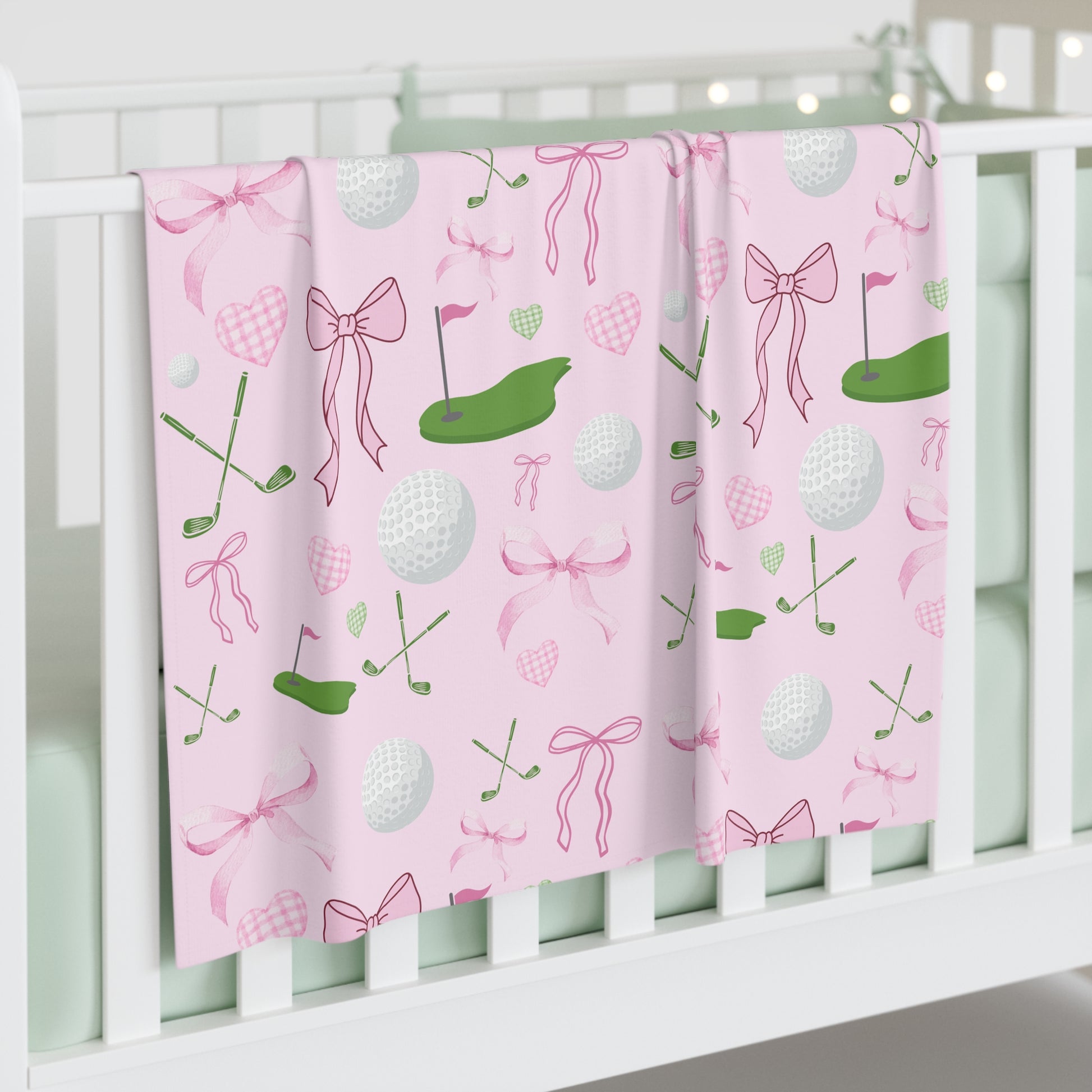 A soft, lightweight swaddle covered in a playful pink golf motif—bows, clubs, tiny hearts and dimpled golf balls scattered like confetti. The smooth jersey polyester wraps a newborn gently while offering bright, long-lasting colors that stay vivid through washings. Sized to tuck and soothe (30"×40"), it doubles as a nursing cover, stroller blanket, or cozy backdrop for milestone photos. The one-sided print brings a whimsical, feminine touch to everyday baby moments, blending sport-inspired charm with nursery sweetness.